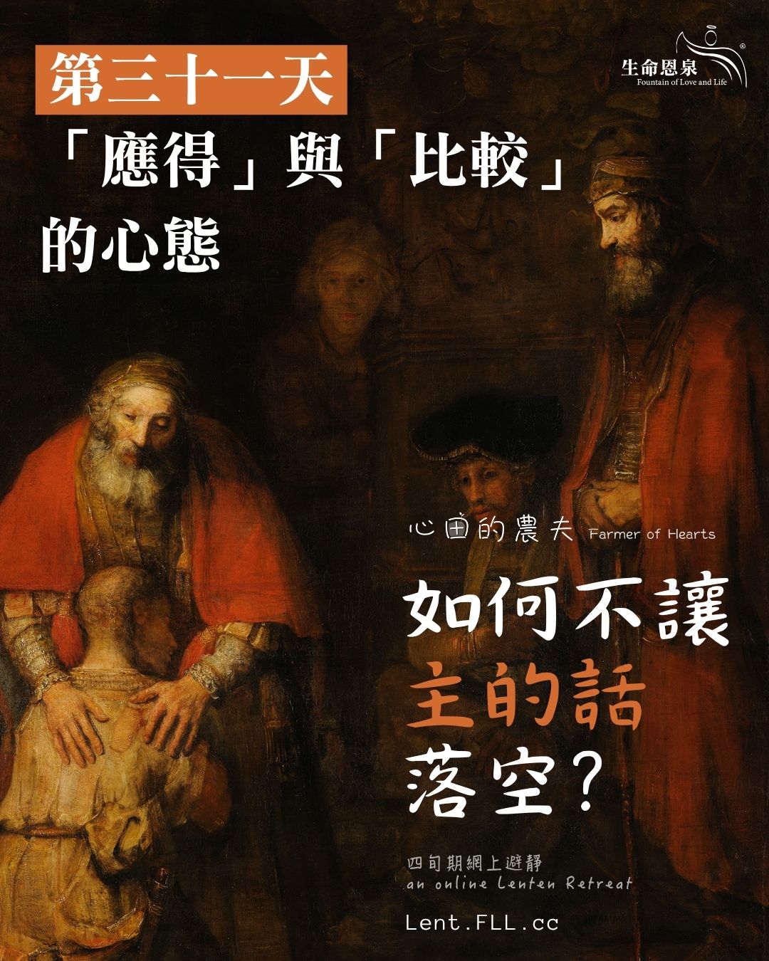 你是否曾因為多年忠心事奉,就覺得天主欠你什麼,當別人看似更蒙祝福時就心生怨憤?今天我們面對心靈更隱蔽的危險。浪子比喻中的大兒子雖然留在家中、勤奮工作,但他的心卻因「應得」的心態、比較和嫉妒而變得剛硬。這種態度能悄悄地使甚至虔誠的信徒遠離父親的聲音。藉著認清這惡者的陷阱,我們能省察自己的心,擁抱謙遜,並回應父親慈愛的懇求,使天主的聖言再次在我們心中扎根並結出果實。